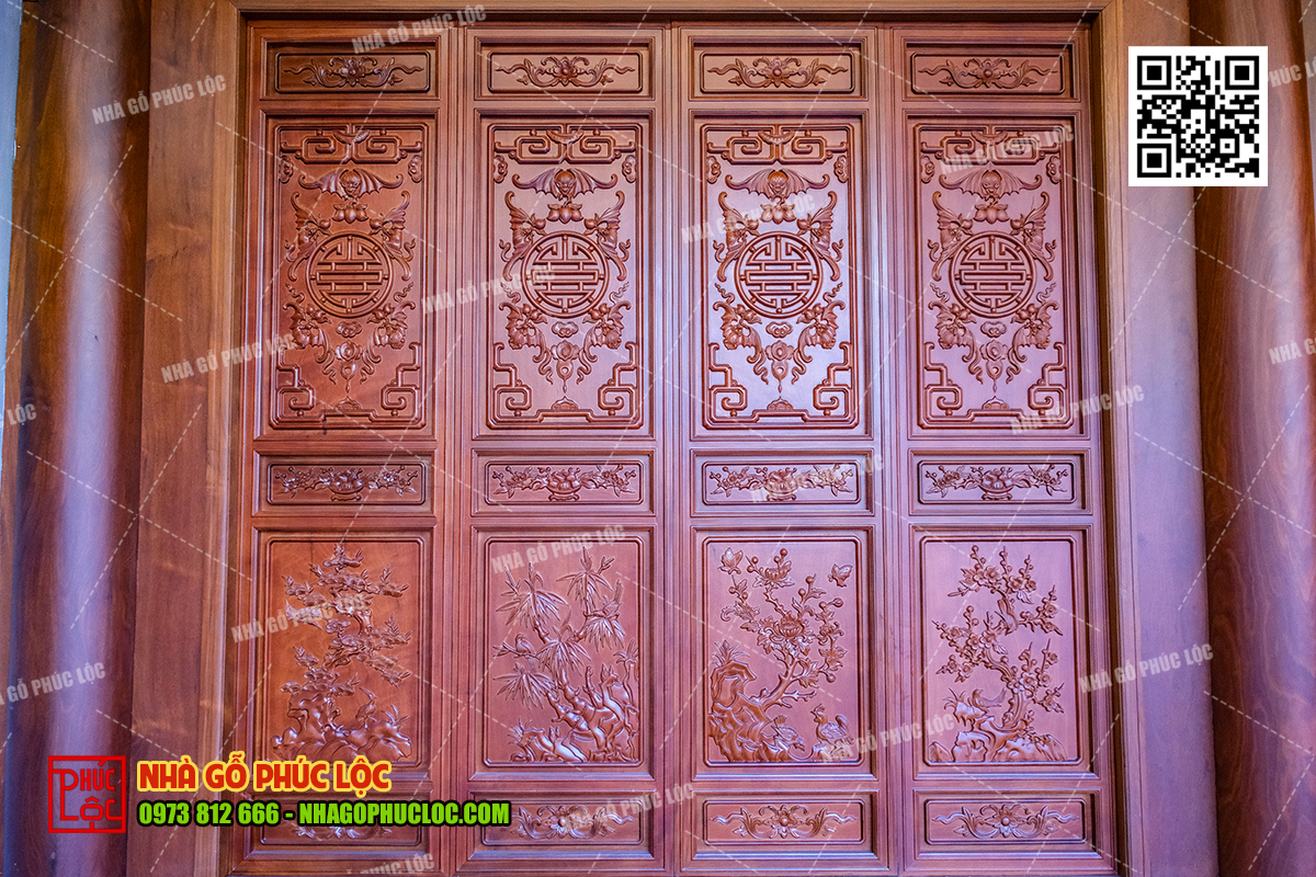 - Một số mẫu hoa văn có thể kể đến như: tứ quý “tùng-trúc-cúc-mai”, “đào-lê-thủ-lựu”, hoa lá lật, ngũ phúc lâm môn. Các hoa văn đều được đục chạm tỉ mỉ, mỗi mẫu họa tiết lại mang một ý nghĩa phong thủy tốt đẹp riêng.