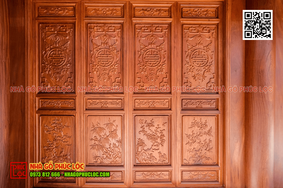Hoa văn chạm khắc trên các cấu kiện như: kẻ hiên, con rường hay cửa bức bàn cần đúng mẫu cổ. Các họa tiết như tùng cúc trúc mai hay liên hoa không chỉ trang trí mà còn mang ý nghĩa phong thủy tốt lành. Một thiết kế chuẩn sẽ thể hiện rõ nét đục chạm tinh xảo, rõ ràng, không bị xáo trộn giữa các phong cách vùng miền.