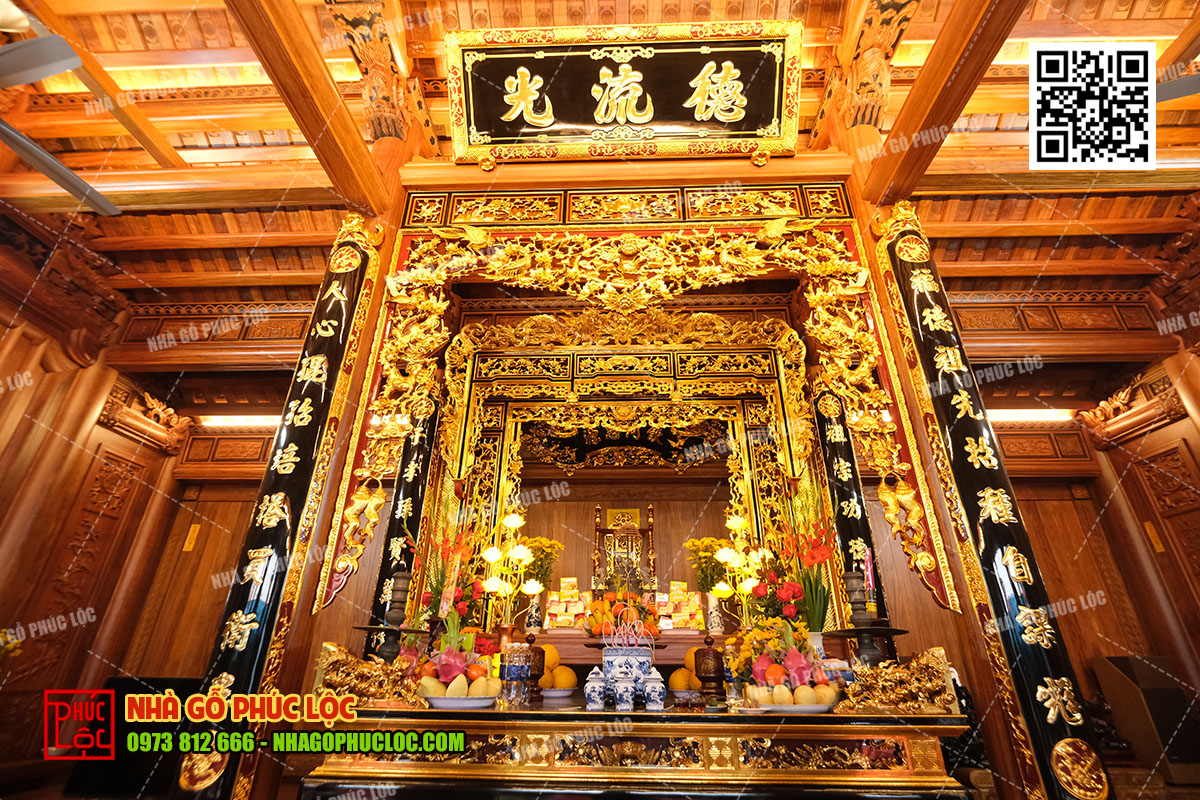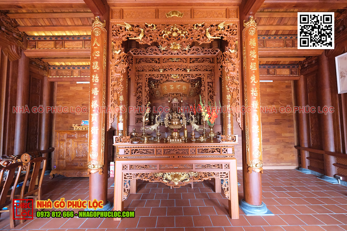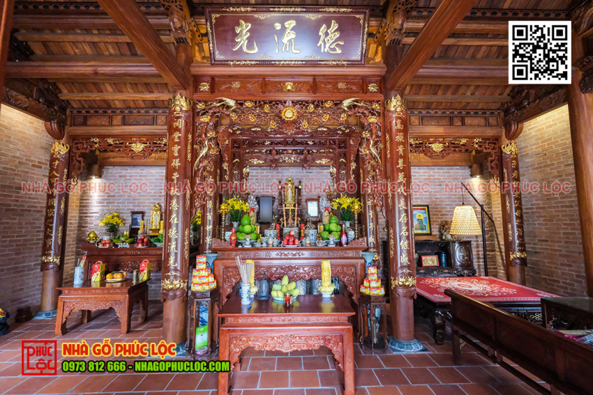Không gian thờ trong nhà gỗ thường được thiết kế trang nghiêm, tinh giản nhưng vẫn toát lên vẻ sang trọng và ấm cúng. Đây cũng là nơi diễn ra những nghi lễ quan trọng như lễ Tết, giỗ chạp hay ngày họp họ, giúp gắn kết các thế hệ trong gia đình. Mỗi chi tiết, mỗi vị trí đặt bàn thờ đều mang ý nghĩa văn hóa sâu sắc, thể hiện triết lý sống tôn kính tổ tiên và hướng thiện của người Việt.
