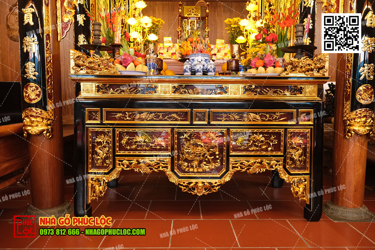 Bàn thờ án gian là kiểu bàn thờ truyền thống lâu đời, thường thấy trong các công trình nhà gỗ cổ ở Bắc Bộ. Bàn thờ có mặt phẳng rộng, phần chân được chạm khắc tinh xảo với họa tiết long – ly – quy – phượng hoặc hoa sen, biểu trưng cho sự thanh cao và phúc lộc. Bàn thờ ông bà tổ tiên phù hợp với nhà gỗ 3 gian hoặc 5 gian, mang vẻ đẹp cổ kính và trang trọng. Khi kết hợp cùng hoành phi, câu đối và ánh sáng vàng ấm, không gian thờ tự trở nên uy nghi, tôn kính và chuẩn truyền thống Việt.